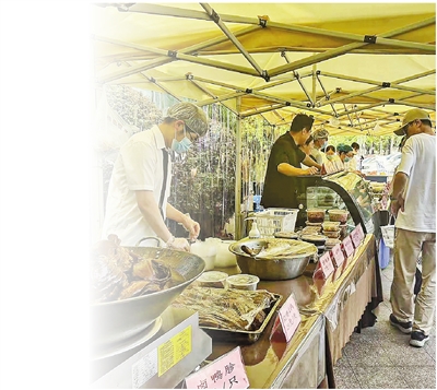 卤鸭、大排、蹄髈、小龙虾……下午4点,湖墅南路一家酒店门口弥漫着浓郁菜香,在可移动的遮阳棚内,家住附近的市民排队挑选起心仪的菜品,酒店工作人员一边麻利地切菜、打包,一边热情地向顾客介绍。