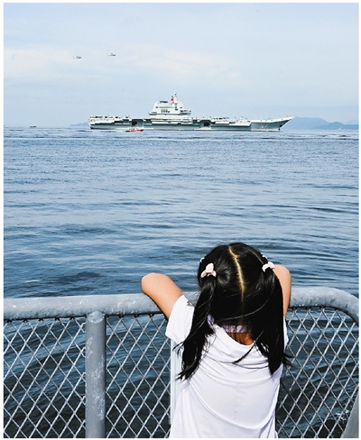 7月3日,一名儿童在岸上观看海军山东舰抵达香港。