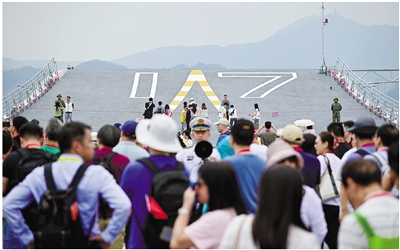7月4日是编队访问香港的首个开放日,主要面向青少年学生开放参观,超一万人次登上山东舰、湛江舰、运城舰。香港都会大学教师王时男说:“我的祖籍是山东,刚刚上甲板的时候,忍不住就哭出来了。那一刻我想到从1840年开始,我们国家的百年屈辱史,今天到这里,就是感觉我们真正地站起来,强起来了。”