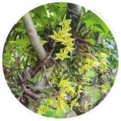 春天梨树抽芽展叶前,他们将驯化两年的石斛苗用麻绳环状系于离地60厘米以上的枝干;待到盛夏,浓密的梨叶为畏晒的石斛撑起天然凉棚;秋冬叶落,石斛又能毫无遮挡地沐浴暖阳——这种顺应天时的“拟境种植”,可以让石斛“近野生”生长,其花青素含量远超大棚种植的同类。梨树周围的地上悄然放置着沾有四聚乙醛的黄瓜片,这是给石斛天敌蜗牛设下的“温柔陷阱”。“这样一来,蜗牛爬上树干啃食的情况就少了很多。”郭红兰说,农场采用“人种天养”的方式,尽可能还原石斛的野生生长环境,从种植到采收的全过程不施任何农药化肥,也不刻意进行除草除虫。