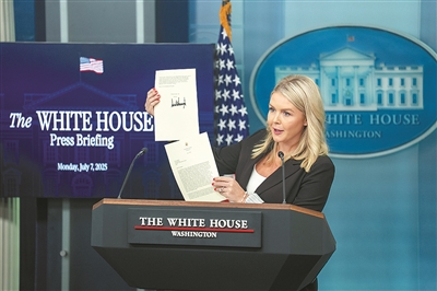当地时间7月7日,白宫新闻发言人莱维特在记者会上展示美国总统特朗普致韩国总统的信函。新华社记者 胡友松 摄