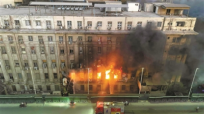 图为7月7日,消防人员在埃及首都开罗一座电信大楼的火灾现场工作。该大楼7日晚发生火灾,已造成至少4人死亡、27人受伤,大开罗地区的移动通信和互联网服务也因此大面积中断。据新华社消息