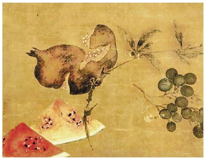 契丹人在征服西域的回纥时,见到了西瓜,并成功引种到契丹(辽)国境。在内蒙古赤峰市敖汉旗发现的羊山1号辽墓,墓室里有一幅表现宴饮场面的壁画,画中就有西瓜,正可佐证胡峤所言非虚。