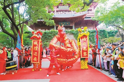 “起轿!恭请城隍老爷出巡!”今年端午节,吴山城隍庙“城隍巡游”民俗非遗活动在杭州城隍阁景区盛大开启。上午9时,巡游队伍从城隍阁出发,由城隍仪仗队引领,途经粮道山、河坊街,所到之处锣鼓喧天,舞龙舞狮、快闪表演等接连上演……为传承“吴山城隍传说”这一非遗代表性项目,让更多市民了解吴山城隍文化,杭州城隍阁通过举办城隍庙会、城隍学堂、城隍巡游等活动,邀请大家登临吴山,沉浸式参与文化活动,领略西湖非遗魅力。