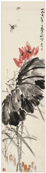诸乐三的《荷花蜻蜓》笔墨简约却意蕴丰厚:石绿与墨色交织的荷叶如伞撑开,胭脂红的荷花点缀其间,振翅低飞的蜻蜓为画面添了灵动。他以粗放笔法绘荷叶,用工细线条勾涟漪,粗与细、动与静的对比,让荷塘瞬间“活”了起来——仿佛能听到蜻蜓振翅、水波轻晃的声音。这幅画没有宏大的场景,却于小景中藏着夏日的细腻意趣,让人想起“小荷才露尖尖角,早有蜻蜓立上头”的清新。