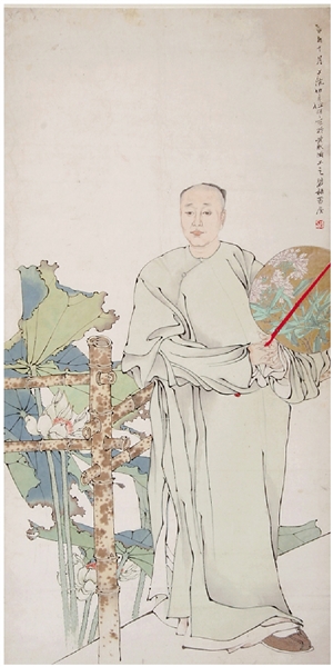 任伯年的人物画以“贴近生活”著称,《凭栏赏荷图》中,文人雅士凭栏而立,目光投向池中荷花,神情闲适淡然。衣纹以顿挫的线条勾勒,既见功力,又显灵动,仿佛能看到微风吹动衣衫的轻缓。夏日赏荷是古人消夏的经典场景,任伯年没有刻意渲染暑热,而是通过人物与荷花的呼应,传递出“以荷为友,凉意自生”的雅趣,让观者仿佛与画中人共沐荷风。