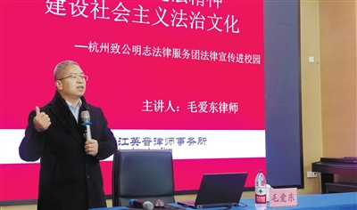 他的这份古道热肠,也感染了行业内许多有志之士,尽己所能伸出援手,帮扶弱势群体,种下法治火种。2015年起,毛爱东牵头成立致公党杭州市委会法律服务团,利用党派身份汇集多家律所人才资源,进园区、进学校、进社区、进工地等,提供有关劳动法、合同法、公司法、刑事犯罪防范、交通事故、人身损害、土地征用等方面的法律咨询、建议和普法宣传。
