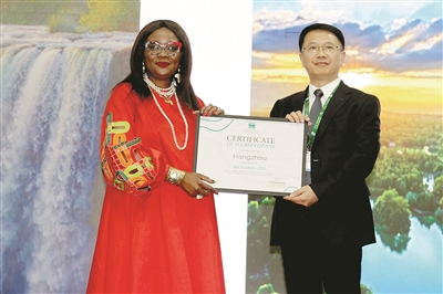 7月24日,在津巴布韦维多利亚瀑布城开幕的《湿地公约》第十五届缔约方大会上,《湿地公约》秘书长穆松达·蒙巴为中国浙江杭州代表颁发“国际湿地城市”证书。 新华社发(塔法拉 摄)