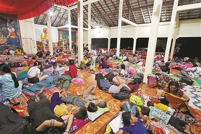 图为7月24日,人们在柬埔寨奥多棉吉省的一处临时安置场所休息。柬埔寨国防部副国务秘书兼发言人马莉淑洁达25日下午说,柬泰边境冲突仍在继续,已有数万名柬埔寨平民被疏散到安全地区。