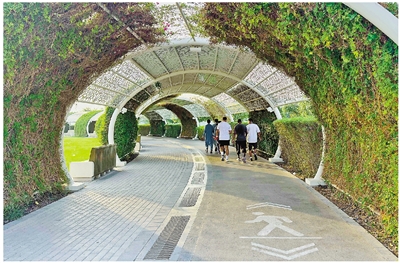 近日,在卡塔尔首都多哈,人们在户外空调步道上行走。卡塔尔属热带沙漠气候,夏季最高气温可达50摄氏度。为缓解高温压力,卡塔尔正将“降温”纳入城市发展体系。 新华社发(尼库 摄)