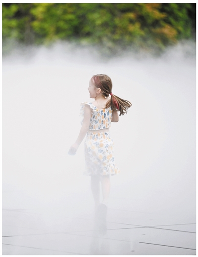 近日,在哈萨克斯坦阿拉木图市,孩童在装有喷雾降温装置的广场上玩耍。新华社记者 李任滋 摄