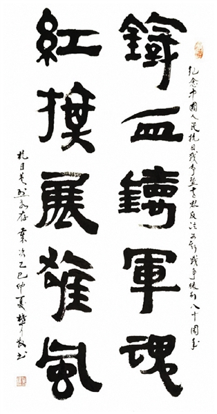 2025年是中国人民抗日战争暨世界反法西斯战争胜利80周年。这一承载着历史记忆与和平期盼的时刻,始终牵动着无数人的心。书法家樵夫怀着对历史的敬畏、对和平的珍视,精心创作了《铁血铸军魂 红旗展雄风》书法作品。作品以苍劲有力的笔锋,于墨色浓淡间重现了那段浴血奋战的峥嵘岁月。