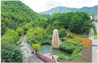 8月6日,在安吉县余村,游客在刻有“绿水青山就是金山银山”的石碑前留影。 新华社记者 毛竹 摄