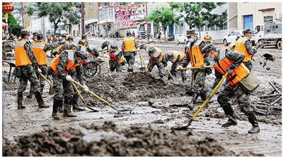8月10日,武警甘肃总队机动支队官兵在兰州市榆中县城关镇兴隆山村清理淤泥。 新华社发(侯崇慧 摄)