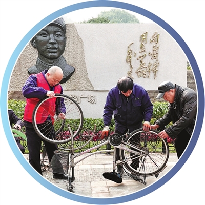 1月5日,孔胜东(左一)和他的志愿者团队在雷锋广场为市民义务修车。 记者 李忠 摄