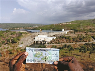 图为工作人员日前在几内亚杜布雷卡省以凯乐塔水电站为背景拍摄的印着水电站的2万几内亚法郎纸币。由中国水利电力对外有限公司承建的凯乐塔水电站机组投入运营后,推动几内亚清洁能源占比飞速跃升,该水电站已成为中几能源合作标志。