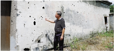 来国钧指着弹孔墙向记者介绍当年那段历史。