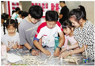“木”课堂上,孩子们用雪糕棒搭桥。市规划馆供图
