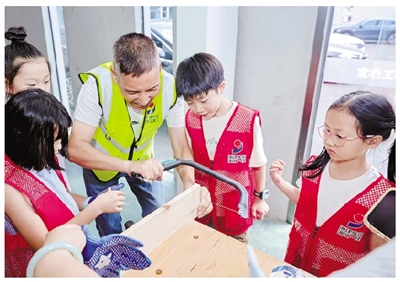 在浙建集团“鲁班研学工坊”,“小候鸟”们聆听浙江省特级技师程泰德讲述“了不起的建筑”,体验“拼搭小屋营”“制作小木凳”等趣味手工活动。研学活动让周景文小朋友收获满满,“通过这次活动,我更理解爸爸妈妈工作的意义,也为他们感到骄傲!”