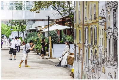 “步子再收些,头稍低,看镜头……对,就是这个感觉。”摄影师举着手机轻声引导,模特身着燕麦色呢大衣与灰色贝雷帽,全力配合。短短1小时,模特完成了4套服装的拍摄,这样快节奏的场景,成了山泽里街区的日常。