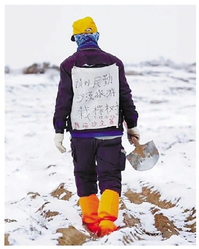 甘肃民勤志愿者王军:“请到民勤沙漠旅游栽棵树”,我背后贴了这块布,我每天都背着它,因为不想错过任何机会,多一个人看到都好。