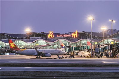 夜幕中繁忙的杭州机场。郑禹从 摄
