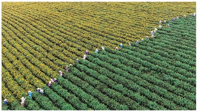 图为8月23日,农民在云南省腾冲市明光镇凤凰村凤凰山上采收万寿菊(无人机照片)。当天是处暑节气,各地积极开展农业生产,田间地头呈现一片繁忙的景象。