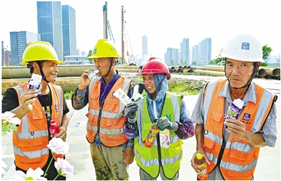 由杭州交投集团西站枢纽公司建设、中建五局承建的杭州云门公园二期工程,自今年4月桩基建设开始,很快就进入到了高温炙烤的日子。“工地上干活,都习惯了。”朱少忠说,“前两天大家刚说要是工地上能有个凉茶摊就好了,你看,这不很快就支起来了!”