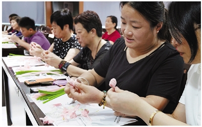 近日,上城区皋城村开办“扭扭棒手工制作桃花饰品”培训课,主动前来学习的村民会聚一堂,认真学习。原来,皋城村在驻村省级文化特派员指导下,正着力打造一座“桃花坞艺术中心”,届时,村民们制作的各种手工艺品都能在“桃花坞”里展陈销售。通讯员 汪淳 文 记者 李忠 摄