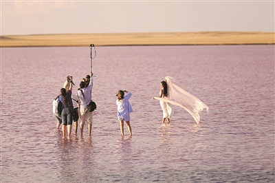 图为8月23日,在哈萨克斯坦阿克莫拉州,游客在科贝图兹湖中拍摄艺术照。