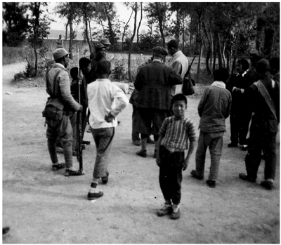 贝熙业(中间背影)与八路军战士及村民在一起。 新华社发(中共北京市海淀区委宣传部供图)