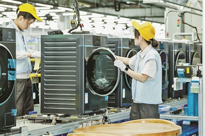 金鱼集团生产车间内,工作人员正在对洗衣机产品进行检查。企业供图