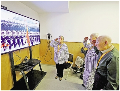 在浙江省人民医院视听室内,数位胸前挂着金灿灿的抗战胜利80周年纪念章的抗战老兵及其他十几位离休干部聚在一起,集体收看阅兵式。 记者 许卓恒 摄