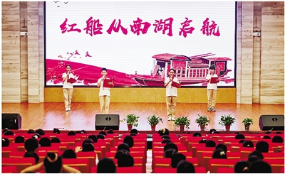 新学期伊始,浙江省嘉兴市南湖区各中小学开启形式多样的以红色教育为主题的“开学第一课”。各校组织师生观看纪念中国人民抗日战争暨世界反法西斯战争胜利80周年大会,同时开展红色故事宣讲、红色课堂、诗朗诵、新四军老战士抗战事迹图片展等活动,带领学生重温烽火岁月、感悟伟大抗战精神,让红色基因深植青少年的心田,激发爱国情怀与民族自豪感。图为9月4日,北京师范大学南湖附属学校学生们在开学第一课主题活动上朗诵诗歌《红船从南湖启航》。