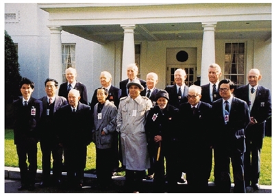朱学三(前排左五)和美国飞行员等在白宫前合影