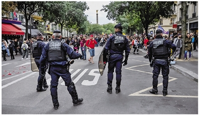 图为9月10日,警察在法国巴黎夏特莱广场附近的游行示威现场警戒。法国多座城市当天发生“封锁法国”大规模游行示威,抗议前任总理贝鲁此前提出、旨在削减财政支出的预算草案。部分地方出现暴力行为,数百人被捕。据法国内政部统计,全国当天总计超17万人参加抗议活动。法国总工会则宣布有25万人参加。
