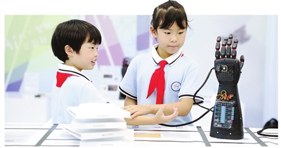 浙大城市学院附属学校302班同学们在“AI未来馆”体验仿生手。 项捷 摄