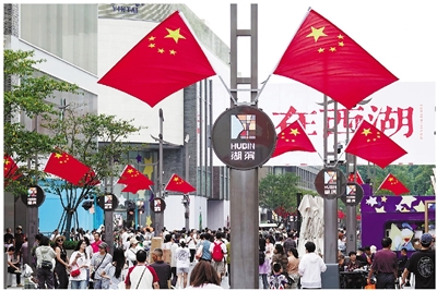 国庆将至,一面面鲜艳的五星红旗在湖滨步行街沿线的路灯杆上迎风飘扬,营造起喜迎中华人民共和国成立76周年的浓厚氛围。 记者 李忠 摄