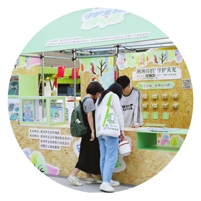 在集章区,市民游客可通过H5链接许下一个跟环保有关的微心愿,随即可免费抽取一张“守护灵宠”种子明信片,象征幸福美满的鸳鸯、调皮机灵的松鼠、濒危保护动物华南梅花鹿、杭州“市花”桂花、杭州“市树”香樟……领取明信片后,可盖上独一无二的“守护生物圈”杭州套色章。