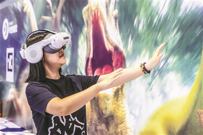 在主题展区,记者亲历了虚拟与现实混合的智能体验——佩戴上一款头戴式显示器,抬头望去,屏幕上出现了一片蓝天与悠悠飘动的白云。平视前方,只见蓝色、黄色、粉色的蝴蝶翩翩起舞,从远方轻盈飞来。记者伸展手掌,蝴蝶徐徐飞来,降落在掌心之上,蝴蝶的翅膀轻轻颤动,花纹也清晰可见,随着手掌缓缓抬升或下降,蝴蝶也随之上下舞动,记者轻轻地合上手掌,蝴蝶便振翅飞向了远方。
