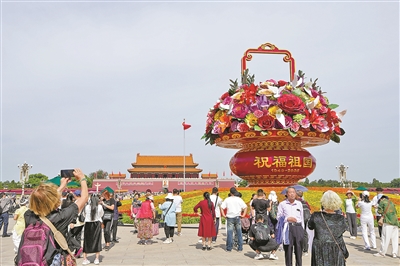 图为9月25日,游客在天安门广场观赏“祝福祖国”大花篮。当天,2025年“祝福祖国”巨型花篮正式完工,亮相天安门广场与市民共度佳节。今年“祝福祖国”花坛以喜庆的花篮为主景,花坛顶高18米,篮体高16米,篮盘直径12米。篮体南侧书写“祝福祖国”“1949-2025”字样,篮体北侧书写“欢度国庆”“1949-2025”字样。篮内选取了美好寓意的花卉,其中荷花寓意“和和美美”、橄榄枝寓意“荣耀和平”等,还结合和平鸽元素,体现“和平发展、欣欣向荣”。