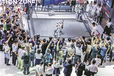 9月25日,在第四届全球数字贸易博览会数智未来主题展区的杭州“六小龙”专区,观众观看宇树科技的人形机器人进行格斗擂台赛。新华社记者 徐昱 摄