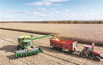 昨天迎来“寒露”时节,全国多地抢抓农时忙农事,田间地头一片繁忙景象。图为10月8日,在北大荒集团黑龙江格球山农场有限公司玉米地块,农机在卸粮。