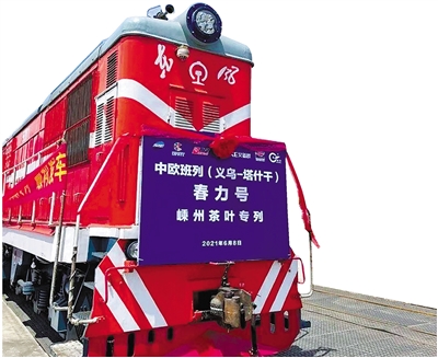 2021年6月,满载着100个标箱茶叶及茶系列产品的X9216次“春力号”嵊州茶叶专列,从义乌西站鸣笛启程,驶往乌兹别克斯坦首都塔什干,标志着长三角首趟茶叶专列成功开行。该趟茶叶专列由春力茶业定制,吹响了珠茶生产企业积极突围的号角。