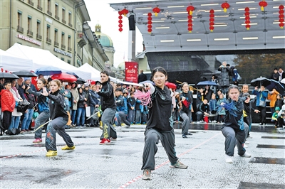当天下午,文化节现场上演中国武术、中国传统舞蹈、川剧变脸、中国民族乐器演奏,以及瑞士传统阿尔卑斯山号演奏等节目。现场还设有香囊及漆扇制作、中国书法、民族服饰展示等近20种文化体验项目,吸引了众多当地民众参与。图为表演者在文化节上展示中国武术。