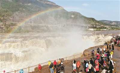 10月27日,游客在山西吉县黄河壶口瀑布景区游览观瀑。当日,位于山西吉县和陕西宜川县交界的黄河壶口瀑布景区天气晴好,飞溅的水雾在阳光照射下,形成一道壮美的“彩虹桥”。 新华社发(吕桂明 摄)