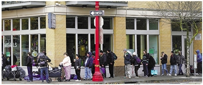 11月4日,在美国俄勒冈州波特兰,等待领取免费食物的人们在街头排起长队。 新华社记者 吴晓凌 摄