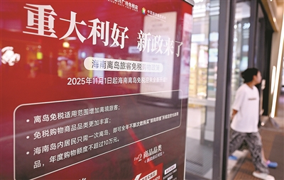 这是海口日月广场免税店门前的免税购物新政展板(11月1日摄)。 11月1日起,海南离岛免税购物新政正式实施。适用人群扩至离境旅客,享每年10万元免税额度且不限次数;岛内居民一个自然年度内有离岛记录,可全年不限次购买15类“即购即提”商品。 新华社记者 郭程 摄