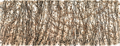 在近几年的创作中,崔振宽的创作又入新境。笔法返璞归真,枯笔焦墨间涌动原始生命力;意象破界共生,山石、树木、石雕、花卉等各种符号自由交织。