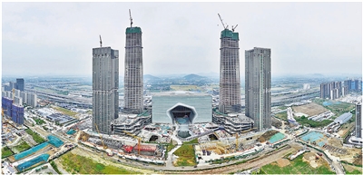 据悉,“金手指”综合体项目位于云城核心区、杭州西站枢纽站房南侧,项目包含建筑高度约320米的A塔楼、约300米的B塔楼、约213米的C、D塔楼以及约80米的云门;目前,A塔楼“金手指”施工至60层,高度已超270米,正奋力冲刺320米苍穹。 余杭国际体育中心项目总建筑面积约53.4万平方米,规划建设“一场两馆”,项目整体预计于2027年完工并投入使用。 记者 李忠 摄